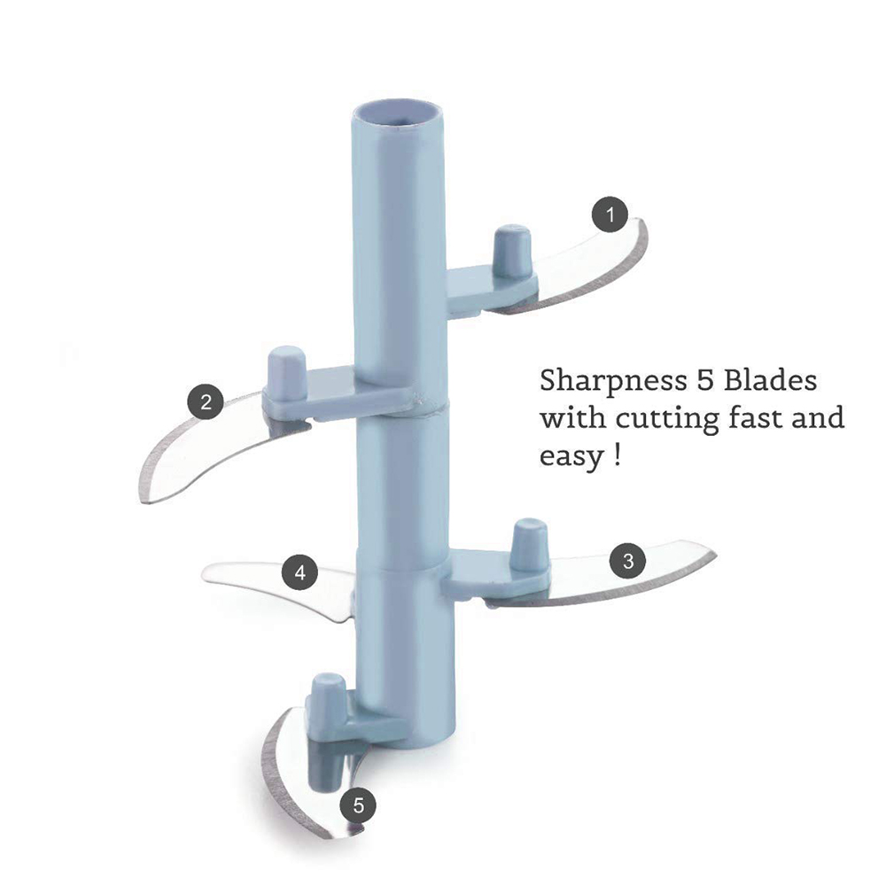 • Vegetable Chopper, Cutter, Mixer for Kitchen with 5 Stainless Steel + Whisker Blade. Perfect for Processing with Stainless Steel Blades: onions, garlic, tomatoes, vegetables, salads, herbs, fruits, boneless meat, nuts and more in seconds