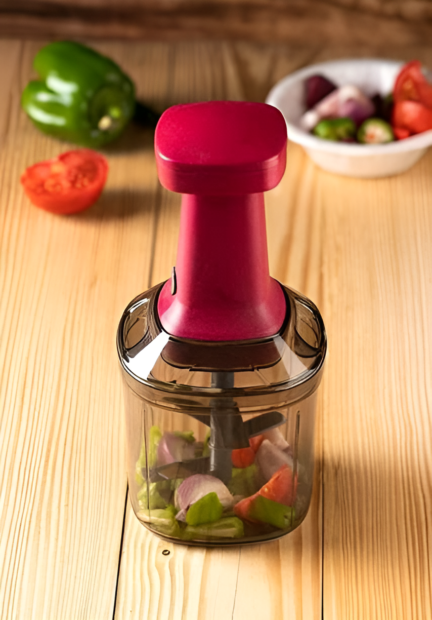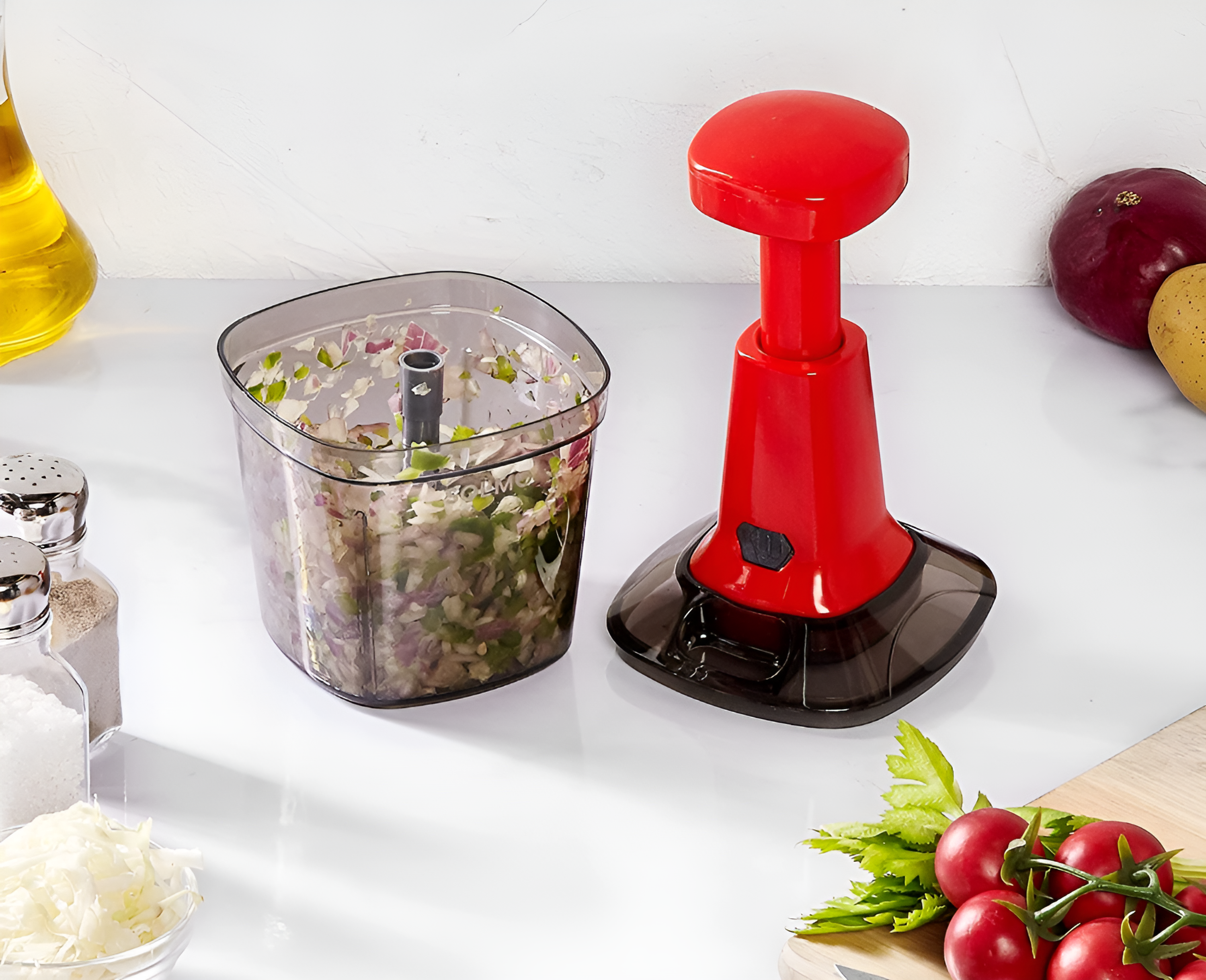 The slapping chopper makes chopping vegetables and nuts quick and easy. The sharp stainless steel blade rotates with each slap for smooth, even cutting. It's great for chopping, grinding and crushing garlic, onions, tomatoes, fruits, nuts, herbs, vegetables cutter and more. 8.5-Cup Capacity. Features a sharp stainless steel chopper blade, anti-s bowl, easy pump handle collapsible for compact storage. 100% BPA free, food safe. Blades are concealed during use for the utmost safety The chopper cup body and lid are separable. You can remove the blade and wash it with water directly after chopping the food. Blades and bowl are top-rack dishwasher safe Large & Powerful Device Includes Bowl, Removable Sharp Stainless Steel Blade & Cover with Handle. The chopper's slap design protects your fingers from the blade when chopping.